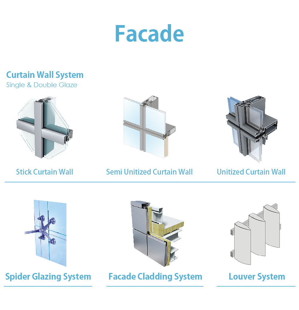 Facade means the exteriors of a building, especially the front most important design feature in modern architectural. Carries no roof or floor loads Fasten to the structural frame (primary structure) and acts solely as an enclosing envelope. Usually consists of metals in combination with glass, plastics and other surfacing materials, supported on metal unit frameworks. Custom design specifically for one major project, using parts and details made especially for this purpose.